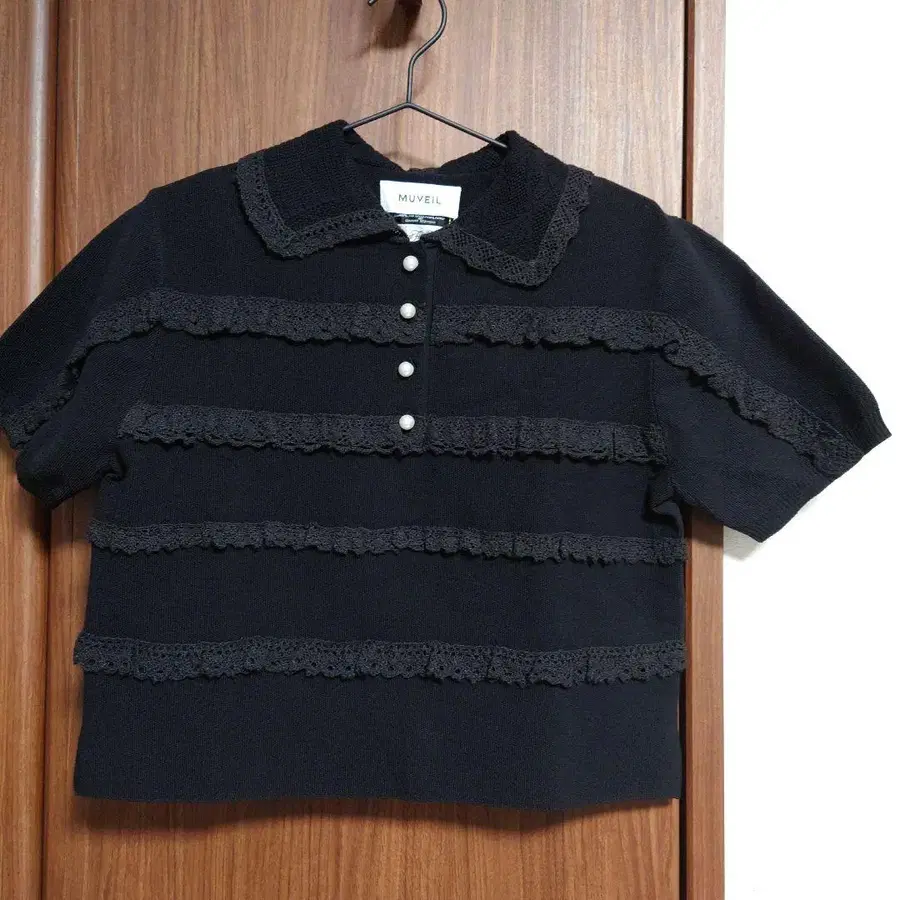 택 포함 MUVEIL 레이스 보더 폴로 니트 36 Black 프릴 펄