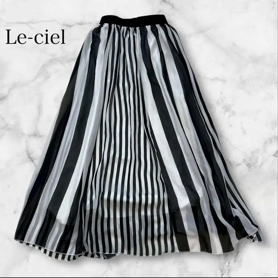 자동 번역되었어요. 원문보기블랙과 화이트 스트라이프 디자인의 플레어 롱 스커트, 허리밴딩으로 쾌적한 착용감.