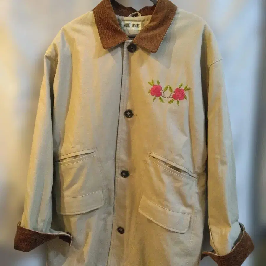 쇼와 레트로 미사용 새상품 장미 자수 베이지 코튼 자켓 (안감 퀼팅)
