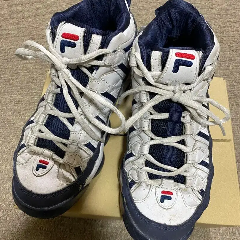자동 번역되었어요. 원문보기FILA의 화이트와 네이비 하이컷 스니커즈.