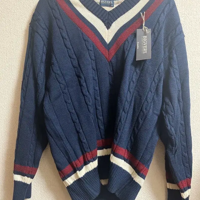 BIGVERY 네이비 케이블 짜임 V넥 스웨터