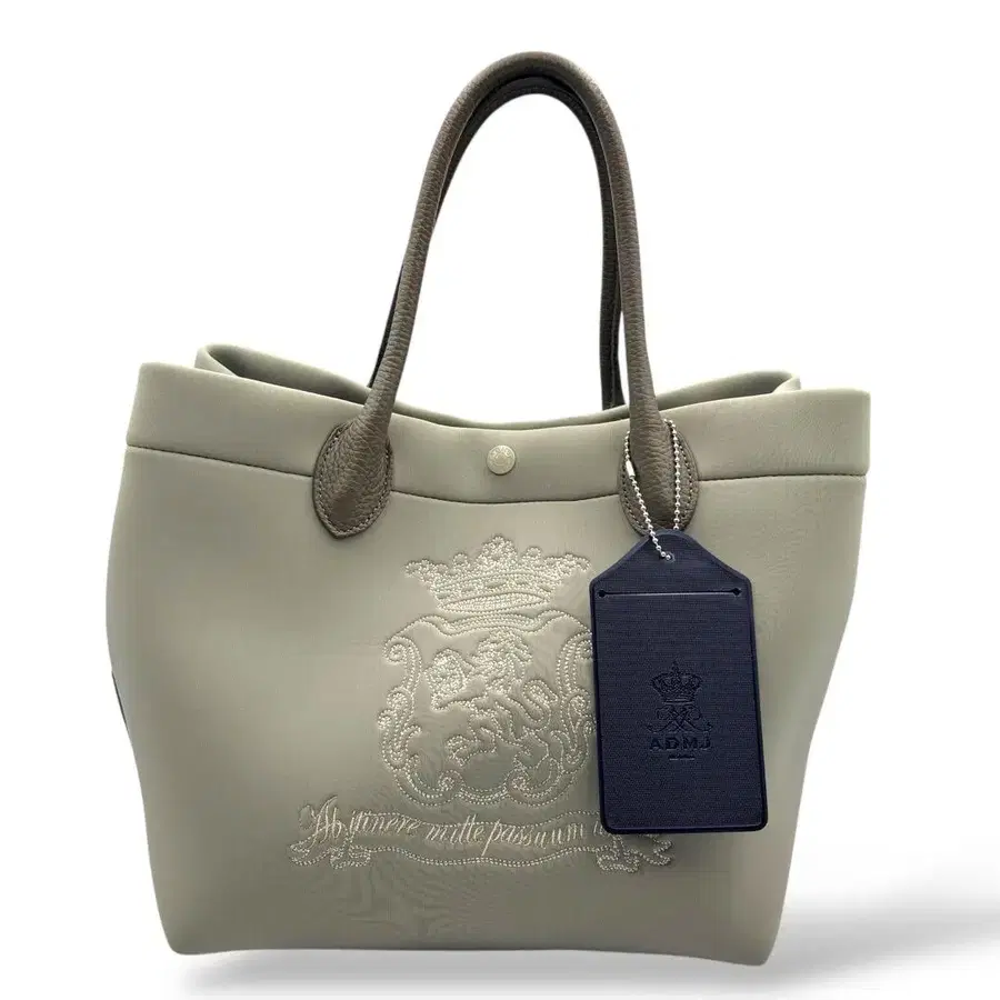 프론트의 자수 문장 디자인이 고급스러운 인상의 토트백입니다.