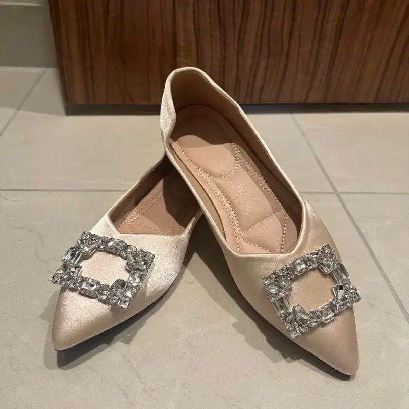 비쥬 포함 베이지 스틸레토 플랫슈즈