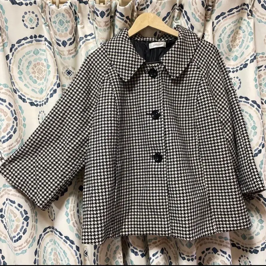 새상품 하운드투스 체크 패턴 울 혼방 7부 소매 코트 루즈핏 3L A라인