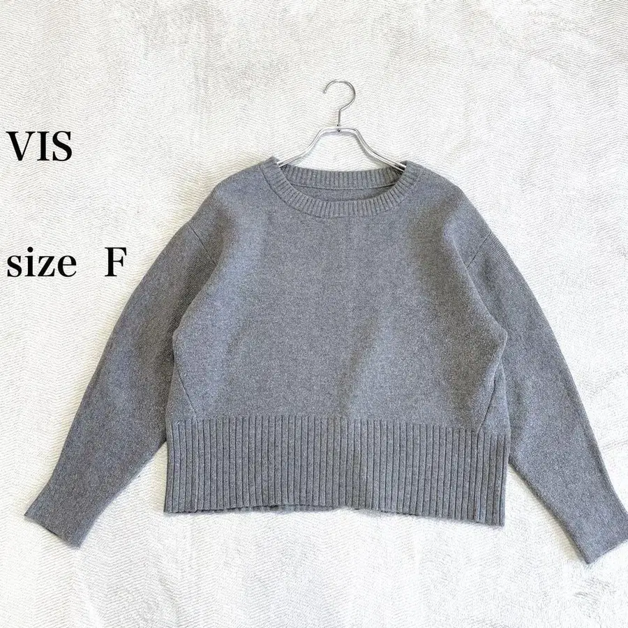 부드러운 그레이 색상의 크루넥 니트, 긴팔 디자인.