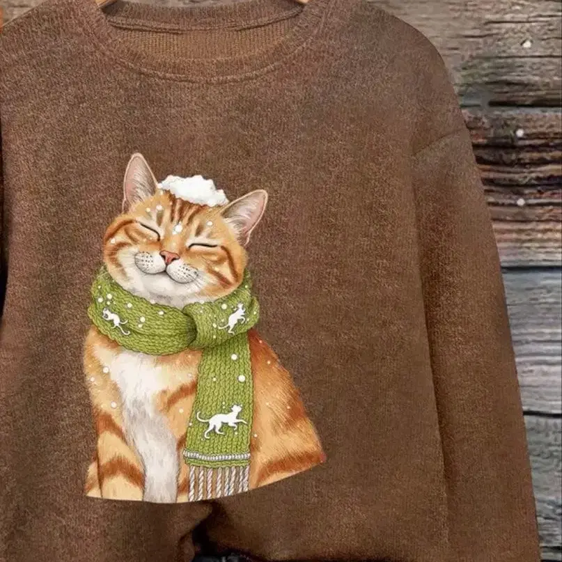 머플러 고양이 부드러운 니트 XL 고양이 패턴 브라운