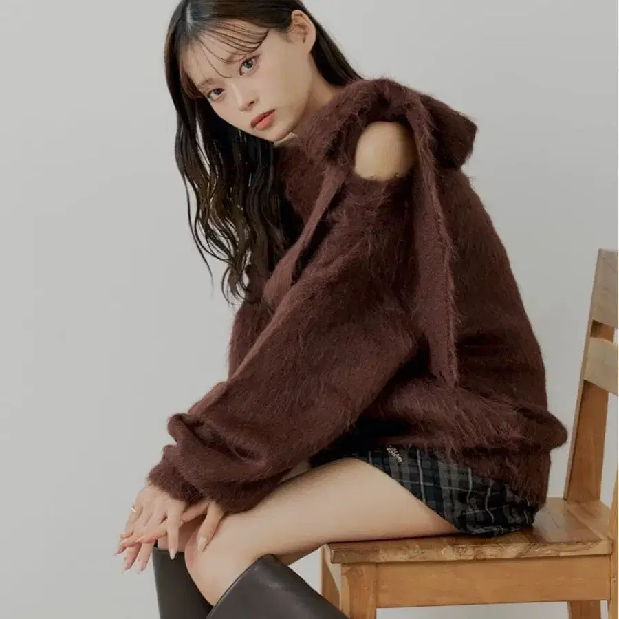 Chico 어깨 리본 숄더 슬릿 오프숄더 샤기 니트 브라운