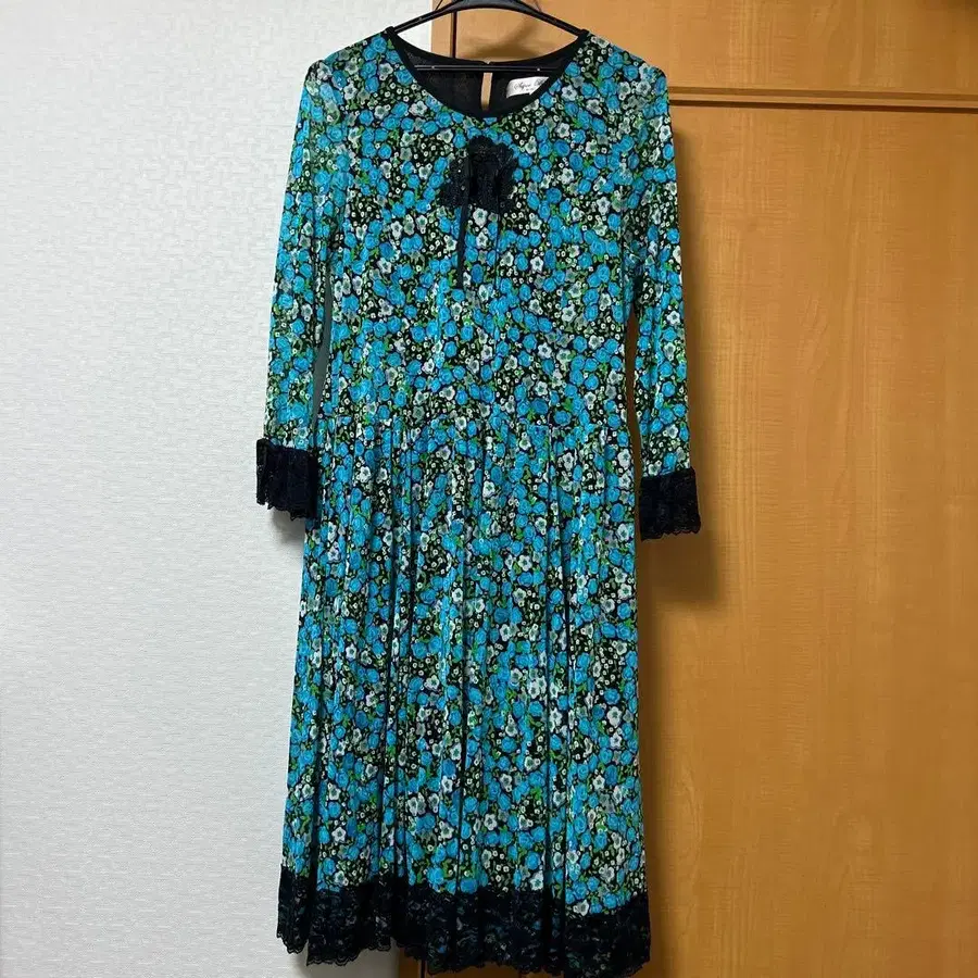 꽃무늬 레이스 트리밍 긴팔 무릎 기장 원피스