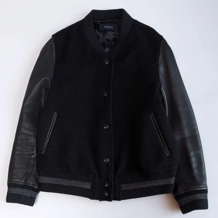 맥피 램 가죽 이종 소재 절개 바시티 자켓 38 모헤어&알파카 혼방 블랙