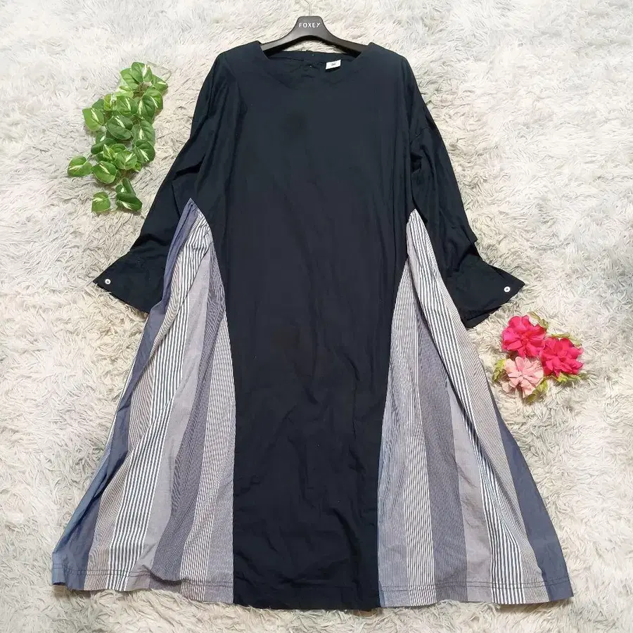 • Gauze 네이비 셔츠 롱 원피스 A라인 7부 소매