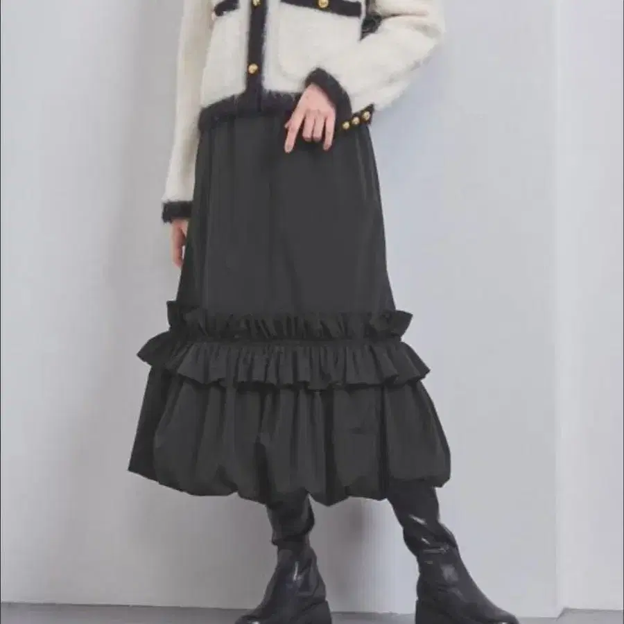 과감한 개더 분량의 입체적인 프릴과 밑단의 벌룬 실루엣이 유니크한 스커트.