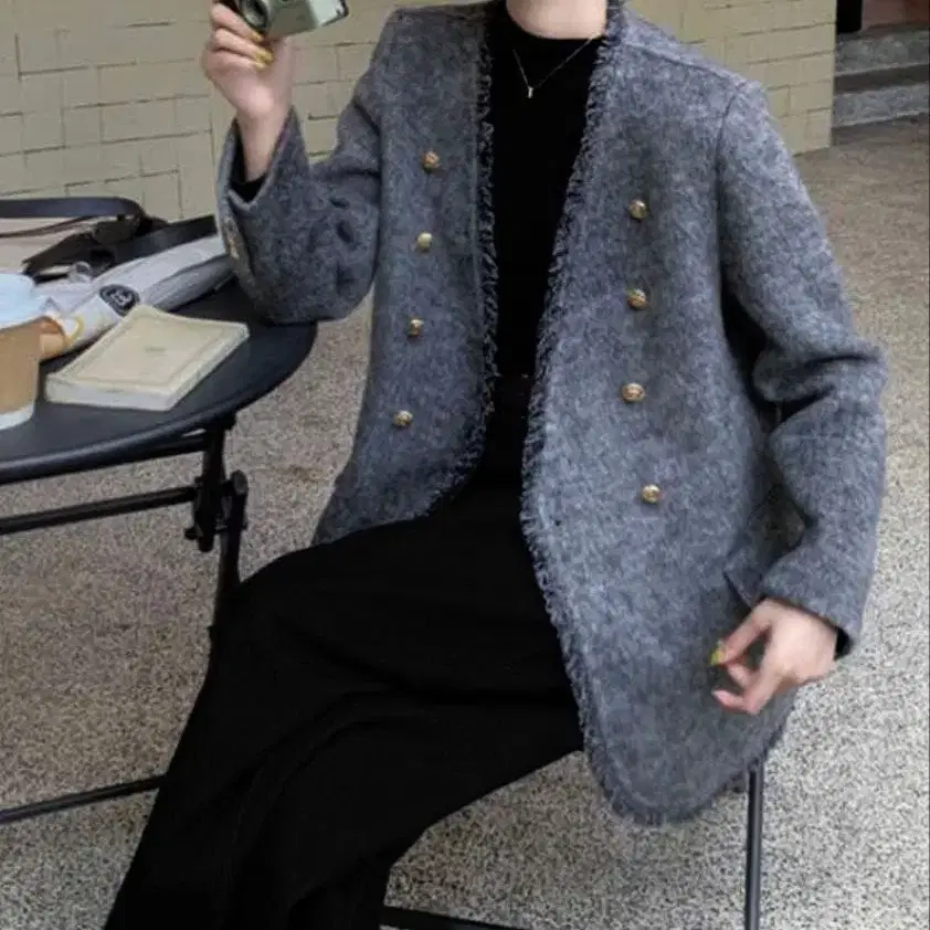 넉넉한 V넥이 인상적인, 기모감 있는 두꺼운 소재의 프린지 자켓.