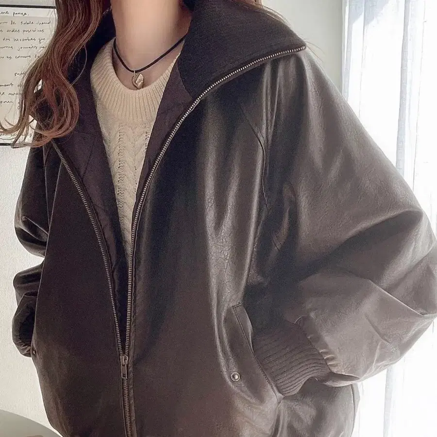 트렌디한 구제 의류 느낌의 페이크 레더 자켓.