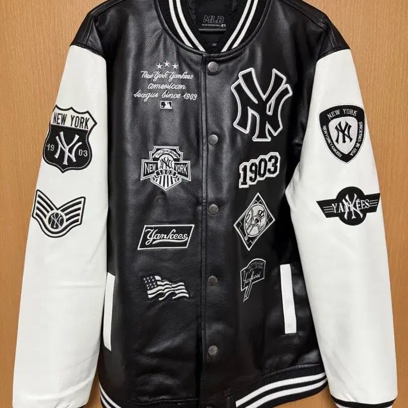 자동 번역되었어요. 원문보기인조 가죽 소재의 블랙과 화이트 바시티 자켓으로, 자수 패치가 특징입니다.