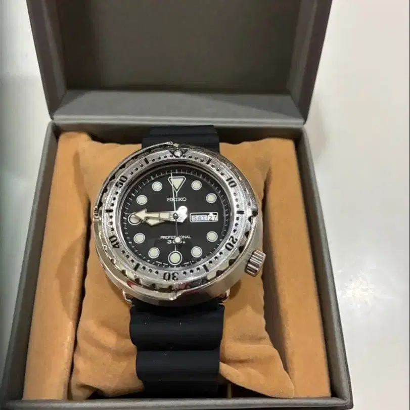 SEIKO의 프로페셔널 300은 내수성과 내구성이 뛰어난 러버 밴드를 갖춘 자동 시계입니다. - 브랜드: SEIKO - 모델명: 프로페셔널 300 - 밴드 소재: 러버 - 색상: 블랙 - 케이스 소재: 스테인리스 스틸 방문해 주셔서 감사합니다. 새상품급 SEIKO 다이버 7c46-7011 SBBN007 프로페셔널 300M 튜나캔입니다. 한 칸 당겨서 날짜 요일 조정 가능합니다. 두 칸 당겨서 시간 조정 가능합니다. 나사식 잠금 가능, 해킹 기능 OK. 다이얼, 바늘 모두 상태 좋습니다. 베젤 인서트는 검은색 빠짐 없이 약간의 흠집 정도로 매우 깨끗합니다. 새 상품으로 교환한 부품 방풍 새 상품으로 교환 베젤 O링 새 상품 프로텍터 새 상품 프로텍터 설치용 정밀 나사 3개 새 상품 오이스터 브레스 새 상품 (원터치로 설치 및 탈부착 가능) 배터리 새 상품으로 교환 완료 SEIKO 우레탄 밴드 새 상품 2.5mm 스프링 바 새 상품 SEIKO 화장품 상자에 넣어 발송해 드립니다. 탈거한 부품 등 사진에 보이는 모든 것입니다. NK, NR로 잘 부탁드립니다. 다른 사이트에도 게재 중이므로, 중간에 취소될 수도 있으니 이해해 주시기 바랍니다.