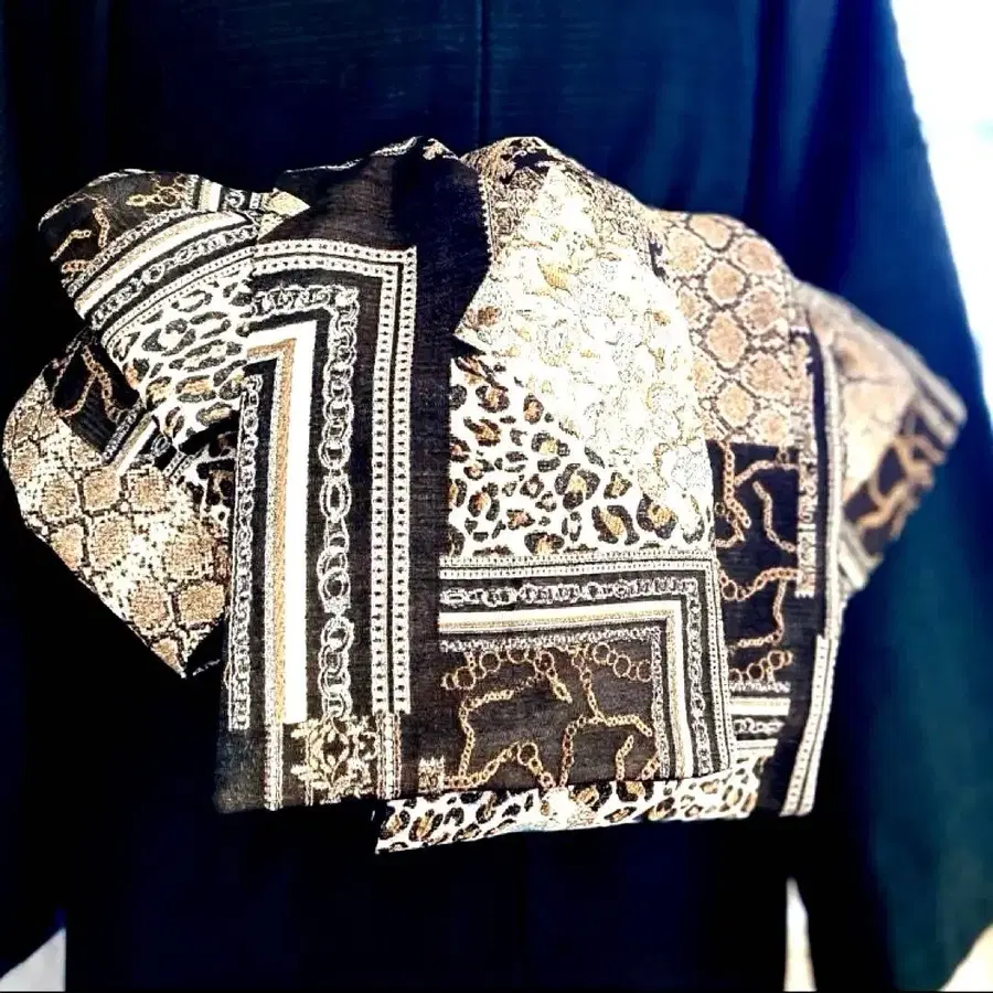 • 후쿠로 오비 블랙 골드 꽃무늬 파도 무늬