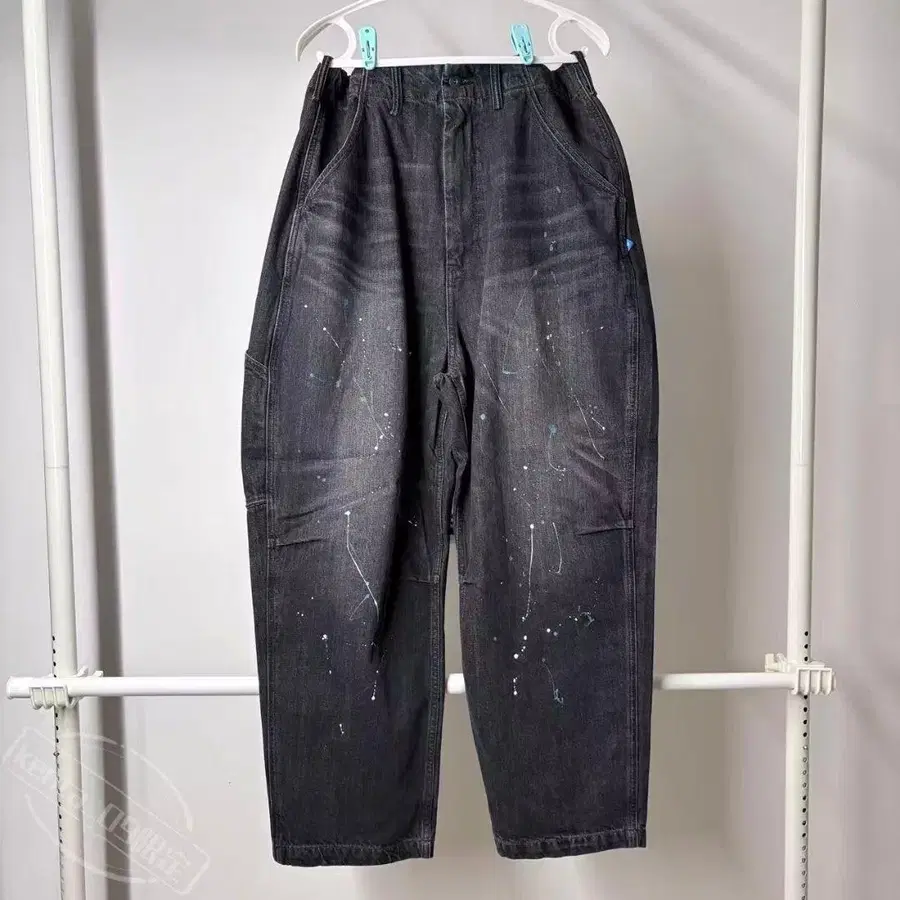 방문해 주셔서 감사합니다. 11.5온스 데님을 사용한, 빈티지 가공이 매력적인 사루엘 데님 팬츠입니다. 포켓 주변과 벨트 루프에는 로프 보강이 되어 있으며, 전체적으로 페인트 드립 가공이 들어간 분위기 있는 한 벌입니다. 라이트 온스로 가볍고, 올 시즌 쾌적하게 착용할 수 있습니다. 이번 시즌은 다크 블루에 강한 블라스트 가공을 하여, 2000년대 초창기를 연상시키는 그리운 무드가 특징입니다. [ 사이즈 ] L 허리 약 90cm/밑위 약 37cm/총길이 약 109cm ※ 개인 측정으로 약간의 오차는 양해 부탁드립니다. 착용은 1회뿐이며, 그 후에는 보관했습니다. 거의 새 상품에 가까운 상태이지만, 어디까지나 한 번 사람의 손을 거친 상품입니다. 부속품은 없으며, 팬츠 본체만 판매하므로 이해하신 후 검토해 주시기 바랍니다. 즉시 구매 OK입니다. 궁금한 점이 있다면 부담 없이 댓글 주세요.