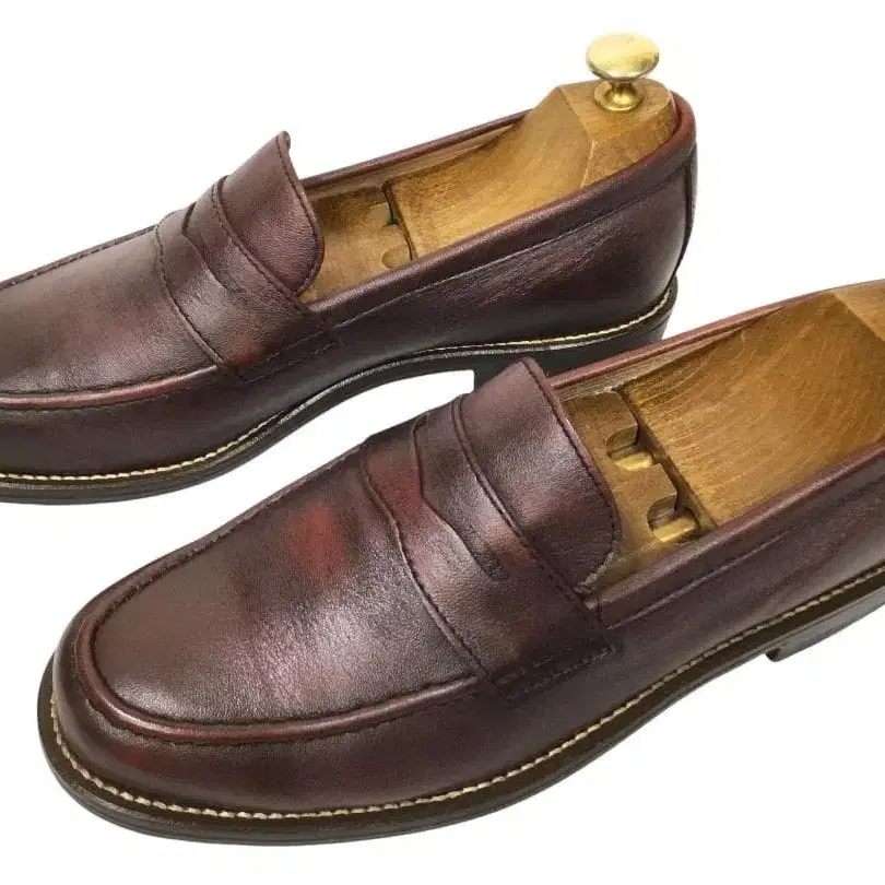 특징: 굿이어 웰트 제법, 360도 라운드 스티치, 안감 전체가 가죽으로 된 제품, 아름다운 라운드토 라스트, 쿠션성이 높고 착용감이 좋은 인솔. 가죽 품질이 매우 부드러워 굿이어 웰트 제법이 느껴지지 않을 정도의 발 편안함과 착용감이 좋은 아이템입니다. 이 상품은 실내에서 의상 촬영 시 사용되었기 때문에, 약간의 미세한 흠집, 얼룩 등이 있지만, 밑창 마모는 거의 없어 새 상품에 가까운 상태입니다.