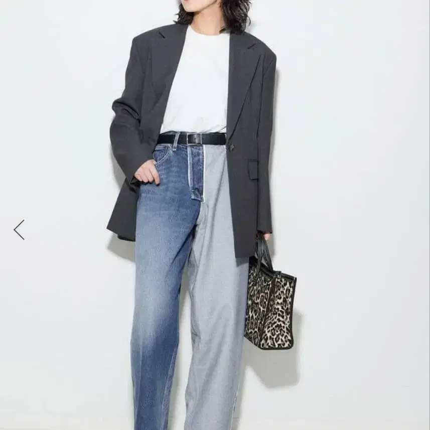 좌우가 다른 청바지를 사용하여 한쪽을 뒤집어 도킹한 위트 넘치는 신선한 한 벌입니다.