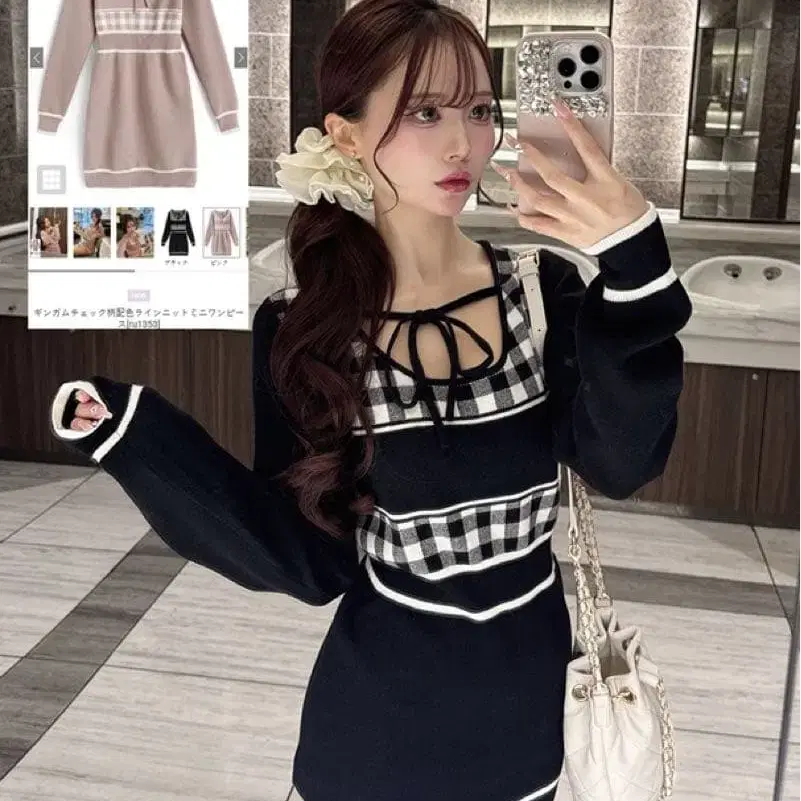 깅엄 체크 패턴 배색 라인 니트 미니 원피스[ru1353]
