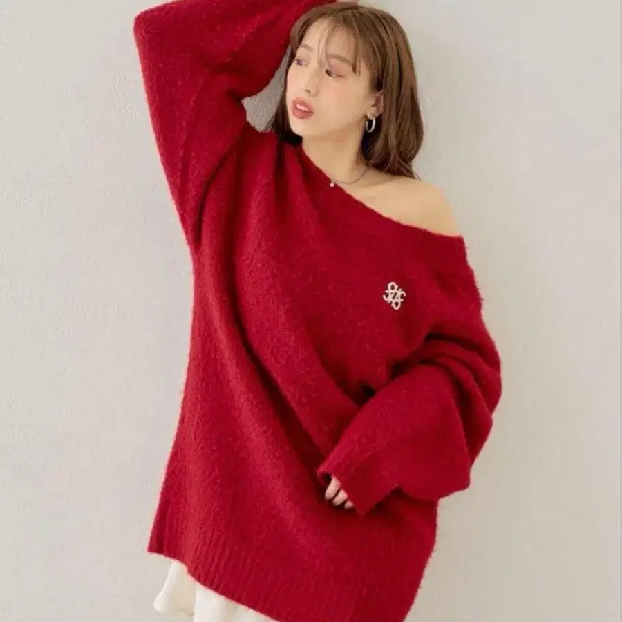 CHICO 오프숄더 니트 빨간색 브로치 포함