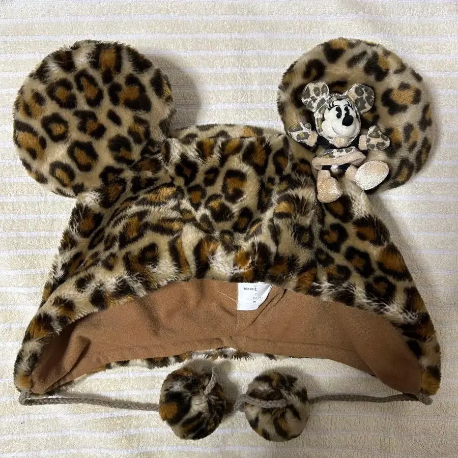 레오파드 무늬의 미니 귀 모자, 플리스 소재로 따뜻하며, 미니 인형이 달려 있습니다.