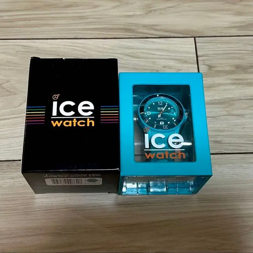 가장 바깥쪽 ice watch 로고가 있는 블랙 케이스는 여는 부분의 모서리가 쭈글쭈글하거나 덮개에 접힌 부분이 있습니다.