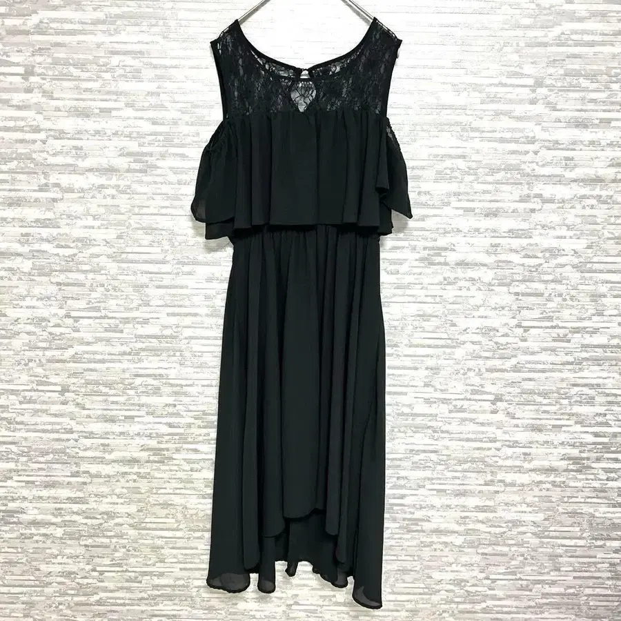 가슴 부분은 레이스 절개로 되어 있으며, 오픈 숄더 스타일의 디자인과 비대칭 밑단이 특징입니다.
