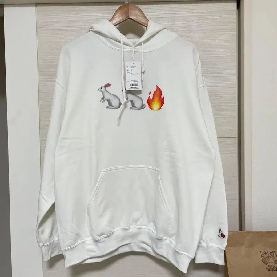 자동 번역되었어요. 원문보기FR2 화이트 후드티, 토끼와 불꽃 디자인이 특징입니다.