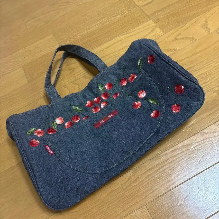 핑크하우스 체리 패턴 데님 블랙 토트백