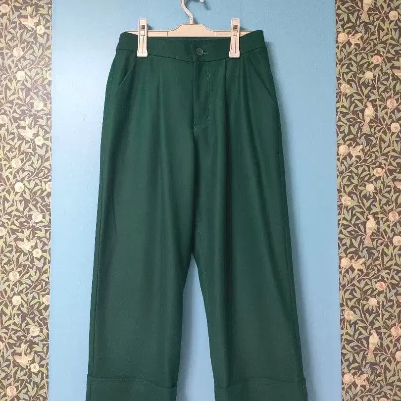 다크 그린 와이드 팬츠, 접힌 디자인과 백 포켓 부착.