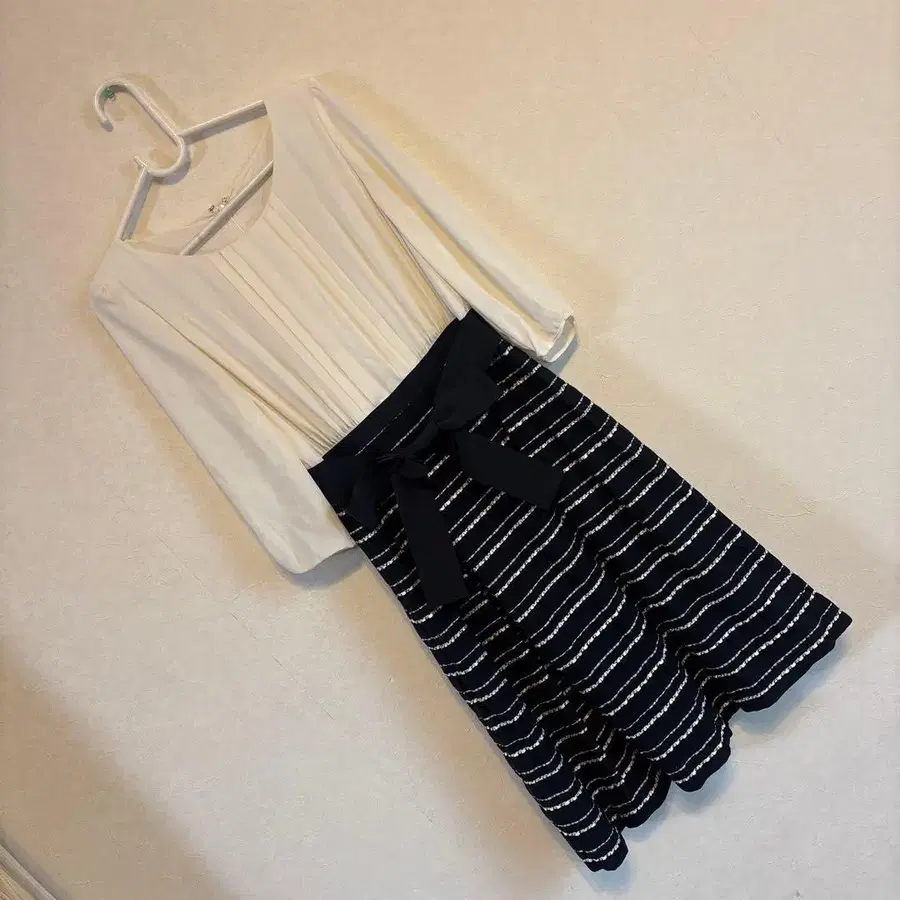 화이트 네이비 무릎 기장 원피스 7부 소매