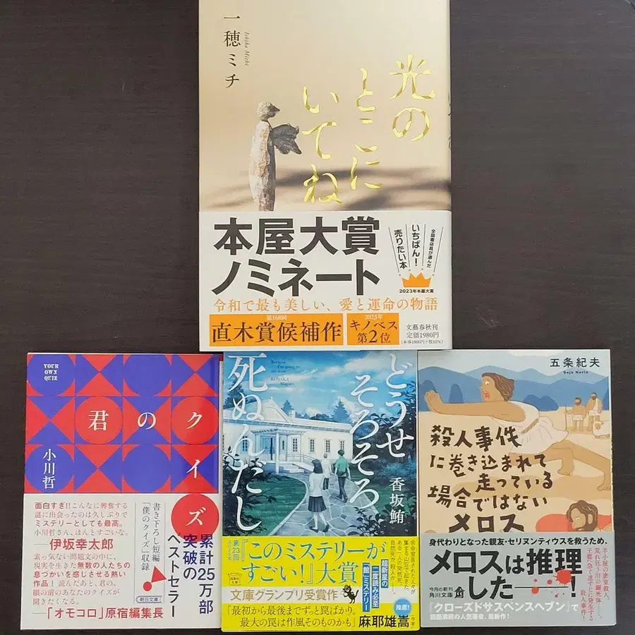 단행본 빛이 있는 곳에 있어줘 이치호 미치 문고본 너의 퀴즈 오가와 테츠 어차피 곧 죽을 테니 카사카 마구로 살인 사건에 휘말려 달릴 때가 아니다 메로스 고죠 노리오 의 4권입니다. 프로필도 한번 읽어주시면 감사하겠습니다. 모두 오비 포함입니다. 서점에 진열된 것 중에서도 가장 상태가 좋은 것을 구매했습니다. 모두 새 상품으로 구매하여 북커버를 씌운 채, 한번 읽은 상품이라 '미사용에 가까움'으로 선택했지만, 어디까지나 제 개인적인 감각이므로 이해해주시면 감사하겠습니다. 과거의 평가도 참고해주세요. ※ 낱개 판매는 하지 않습니다. ※ 제가 신경질적인 편이라 신경질적인 분도 구매하실 수 있도록 정중한 취급을 하고, 깔끔한 상태의 상품을 제공할 수 있도록 노력하고 있습니다. 상태는 좋다고 생각하지만, 자택 보관 중고품임을 이해하신 후에 검토해주세요. ※ 새 상품이 아닙니다. 한번 읽었습니다. 또한, 포장에는 세심한 주의를 기울이겠지만, 발송부터 도착까지 표지에 약간의 접힘이나 휘어짐이 발생할 가능성도 있습니다. 이 점도 이해해주시면 감사하겠습니다. 판매는 예고 없이 삭제될 수 있습니다.