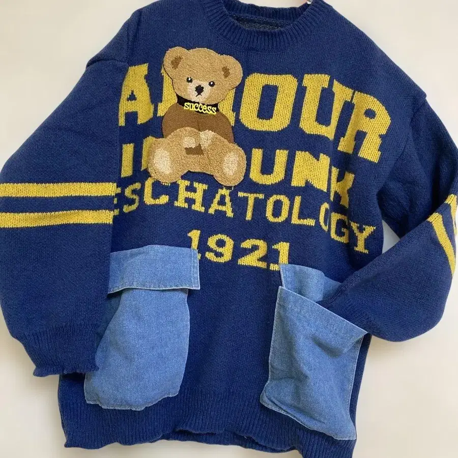 니트 XL 빅 실루엣 스웨터 곰돌이 데님 P 부착 디자인 니트
