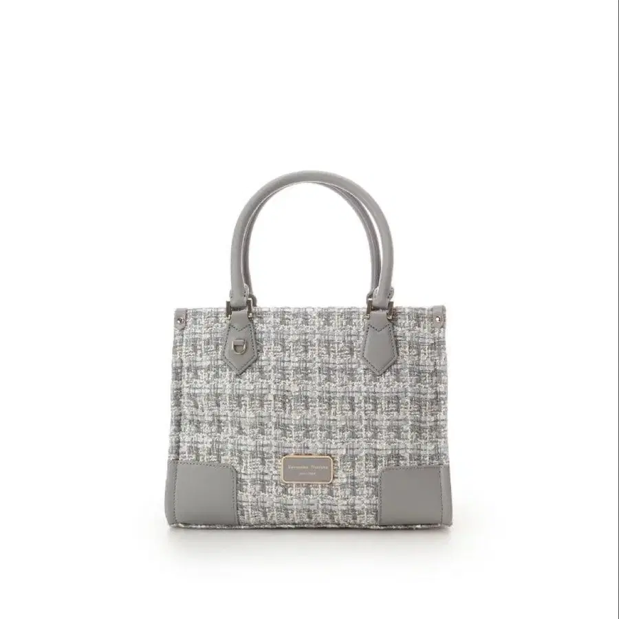 그레이 색상의 트위드 소재를 사용한 토트백으로, 합성 피혁 바닥 부분이 특징입니다.