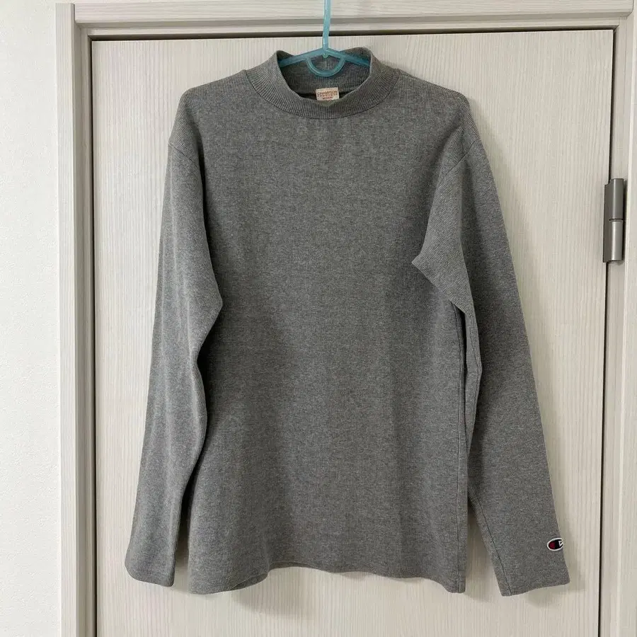 Champion 그레이 코튼 리브 니트 하이넥 스웨터