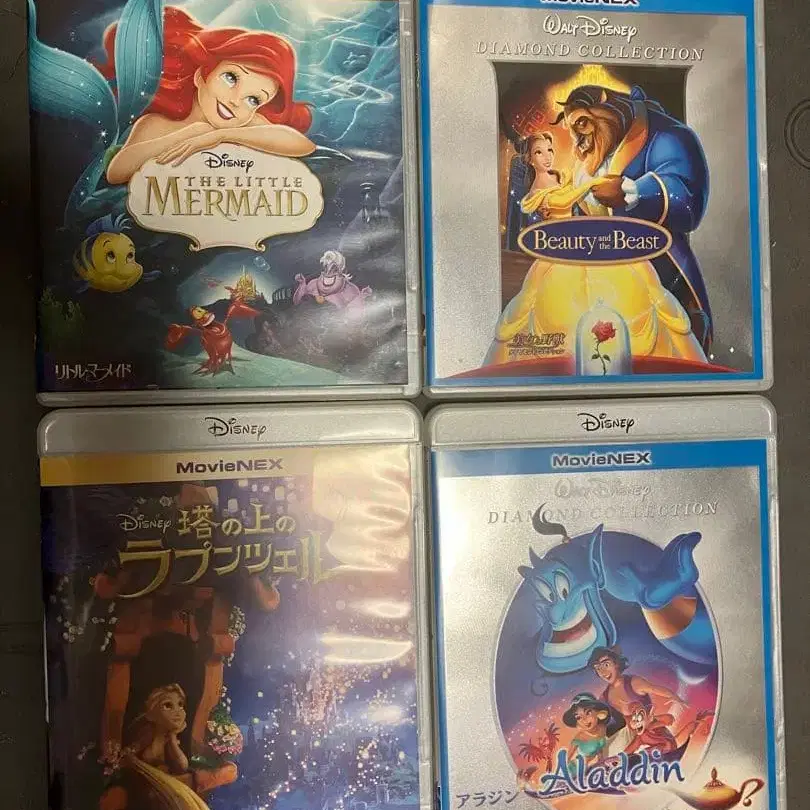 [ 미녀와 야수 ] [ 인어공주 ] [ 알라딘 ] [ 라푼젤 ]의 Blu-ray와 정품 케이스입니다.
