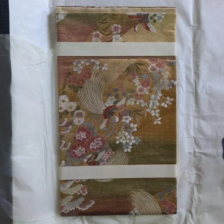 전통적인 일본 의류 오비 골드 컬러 꽃과 새 자수
