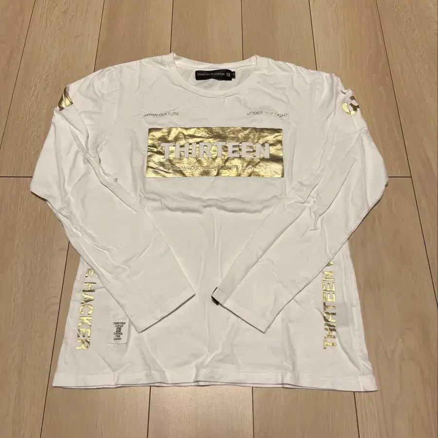 프론트, 백, 양쪽 소매까지 럭셔리한 골드 호일 프린트가 적용된, THIRTEEN JAPAN의 아이덴티티를 상징하는 플래그십 모델 같은 롱T입니다.