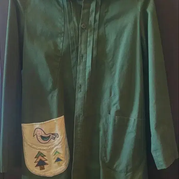 그린 컬러 코튼 롱 코트 자수 포켓 부착