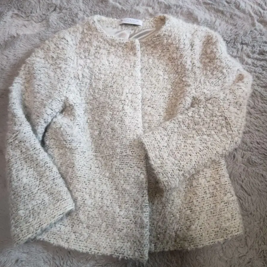 뷰티앤유스의 노카라 자켓 울퉁불퉁 따뜻한 소재감으로 화이트와 블랙이 섞인 듯한 색감입니다. 빅 스냅 버튼 2개로 여미는 디자인은 퍼지는 듯한 디자인이 됩니다. 안감 연결 부분에 약간의 노후화 있음 (착용에는 문제 없음) 양 사이드에 포켓 있음 외출이나 식사 모임, 포멀한 자리에도 캐주얼하게도 [ 브랜드 ] 뷰티앤유스 유나이티드 애로우즈 [ 색상 ] 화이트, 블랙 화이트, 블랙 [ 사이즈 ] 사이즈: 프리 사이즈 가슴 너비: 약 40cm 어깨 너비: 약 35cm 소매 길이: 약 50cm 기장: 약 49cm ※ 약간의 사이즈 오차가 있을 수 있습니다. [ 소재 ] 겉감 아크릴 64% 울 28% 폴리에스테르 8% 안감 폴리에스테르 100% 궁금한 점이 있으시면, 편하게 댓글 남겨주세요. 댓글 없음, 즉시 구매 OK 중고품, 자택 보관에 동의하시는 분, 잘 부탁드립니다. 컴팩트하게 포장하여 접어서 발송됩니다. 접힌 자국 등은 양해 부탁드립니다. 상품 타이틀에 기재되지 않은 상품은 촬영용 아이템입니다. 구매 시 부속되지 않으니 양해 부탁드립니다. 다른 어패럴 상품도 판매 중입니다. 계절감 - 봄, 가을, 겨울 얼룩, 찢김, 냄새 등 - 없음