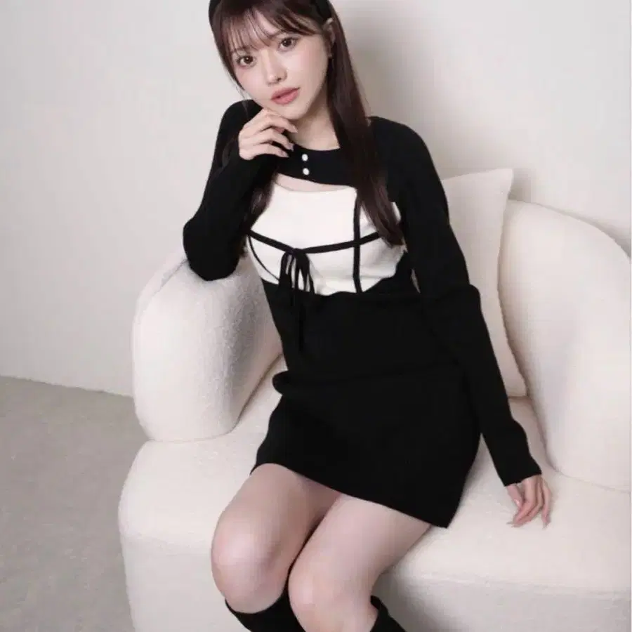 LIPSERVICE 데콜테 오픈 바이컬러 리본 니트 원피스