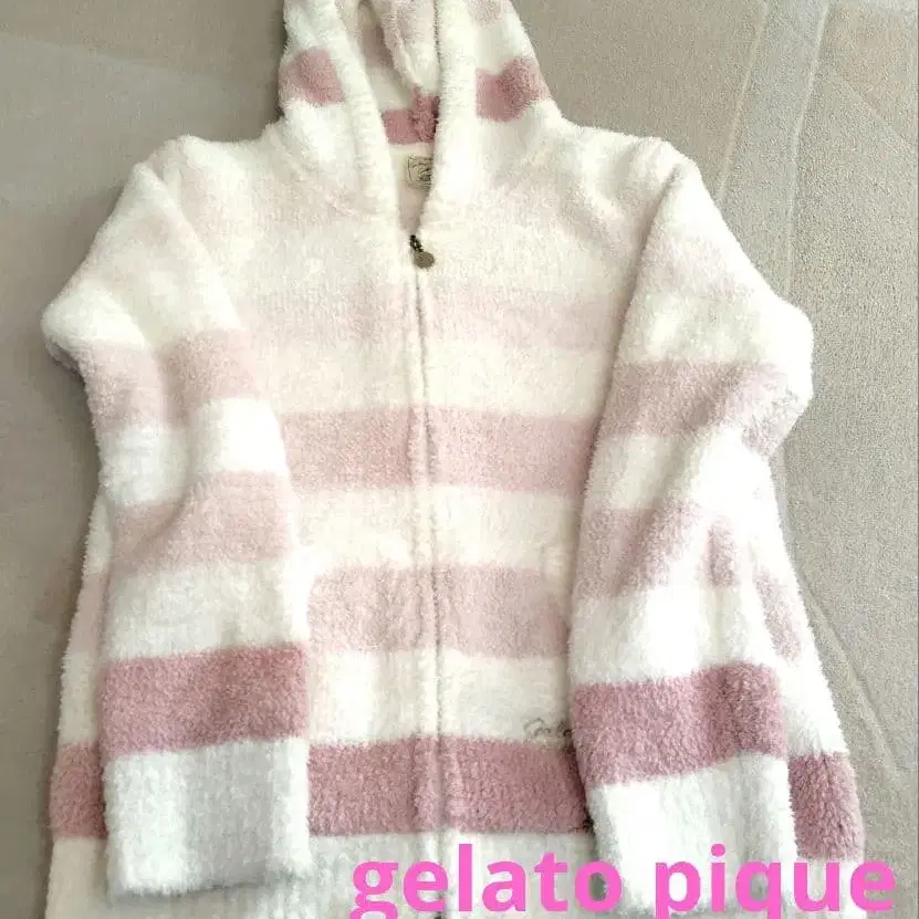 화이트와 핑크 스트라이프. 복슬복슬한 후드 부착 룸웨어.