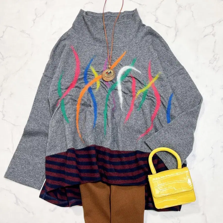 그레이 계열을 베이스로, 컬러풀한 모헤어 자수와 보더 무늬가 시선을 사로잡아 심플한 하의와 매치하는 것만으로도 코디가 완성됩니다.