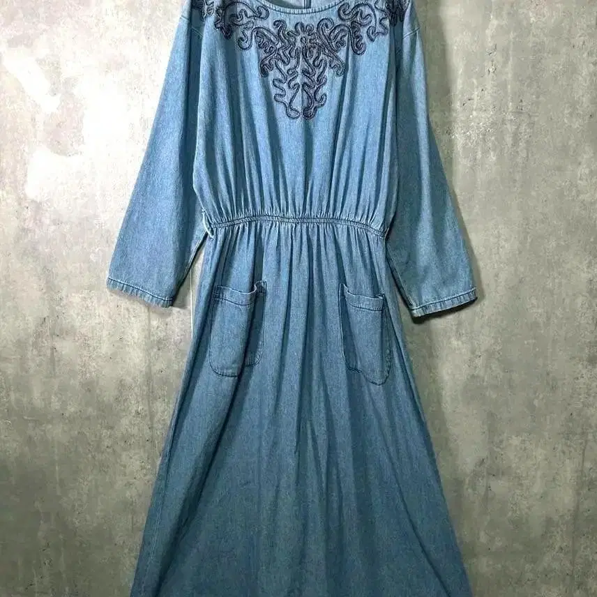 가슴 부분의 코드 자수가 멋스러운 데님 원피스입니다.