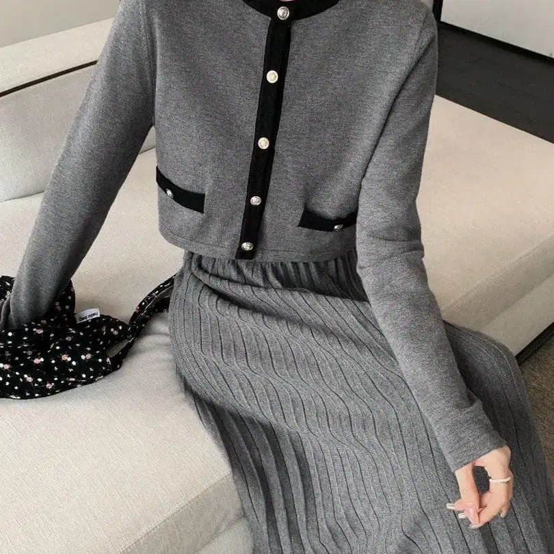 여성용 대비 컬러 크루넥 가디건 & 스커트 2종 세트, 봄/가을