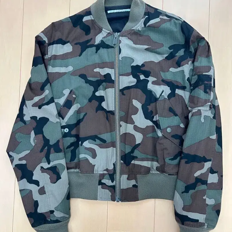 카모 패턴 봄버 자켓, 리브가 달린 스타일리시한 디자인.