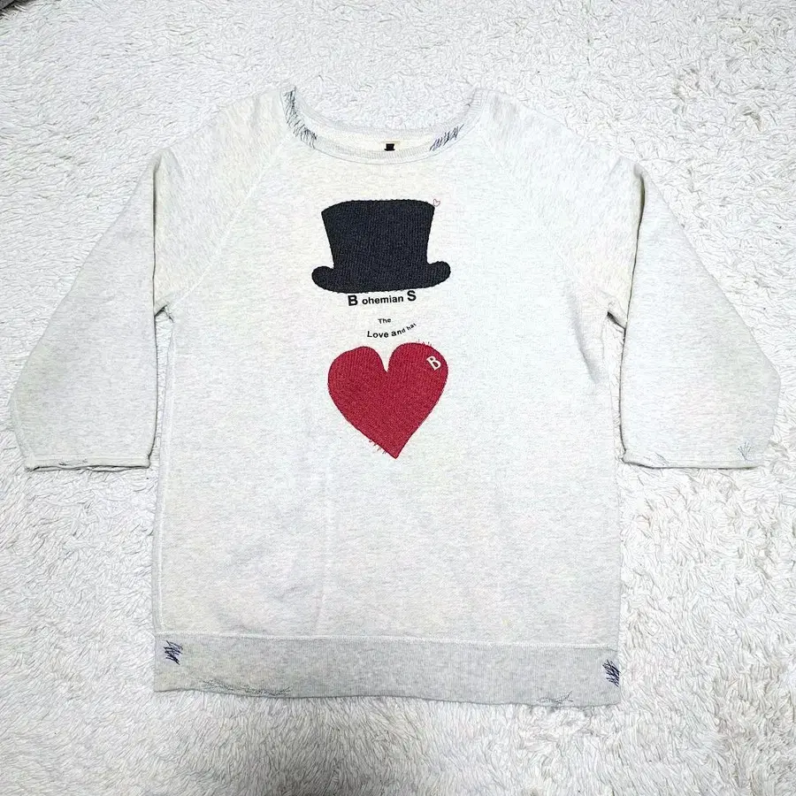 사용감: 오트밀 특성상 색상이 약간 얼룩덜룩한 느낌이 듭니다. 또한, 전체적으로 햇볕에 바랜 듯한 흙색으로 보이는 느낌도 들지만, 이 역시 오트밀 특성인지는 불분명합니다. 얼룩도 몇 군데 있습니다. 행거 자국도 약간 있습니다. 귀여운 러브앤햇 자수가 곳곳에 있어 단품으로도 멋스럽습니다! 5부 소매에서 7부 소매 정도입니다.