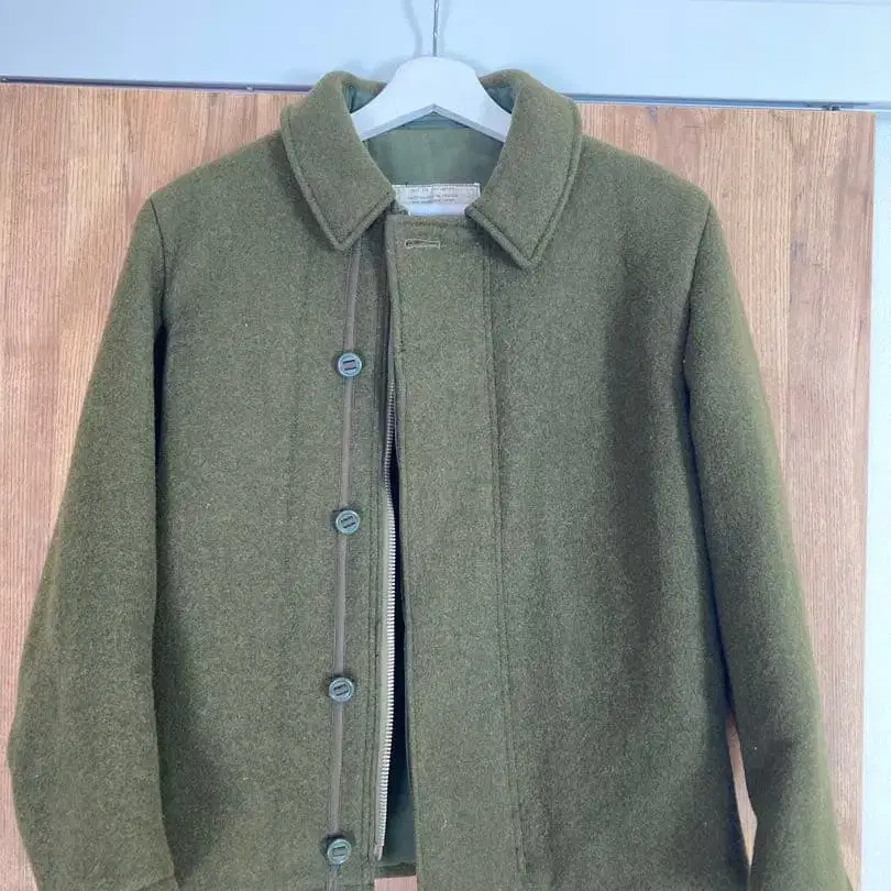 자동 번역되었어요. 원문보기빈티지 울 소재의 올리브 그린 자켓, 프론트 오픈 디자인.