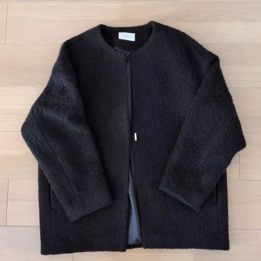 자동 번역되었어요. 원문보기프론트의 골드 하토메 후크가 악센트인 복슬복슬한 블랙 노카라 숏코트입니다.